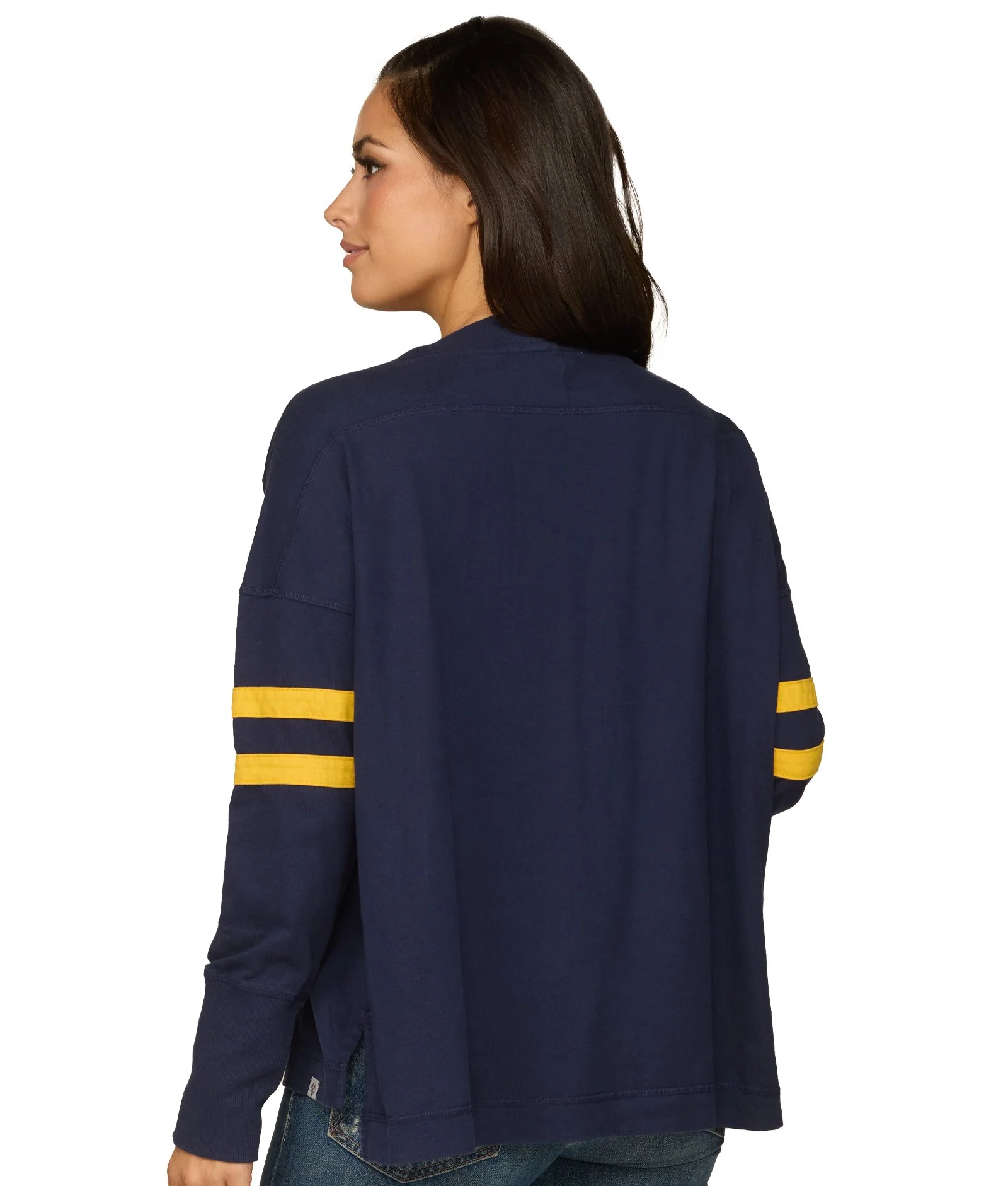 Bring effortless comfort to your game day rotation with this classic oversized knit top. Designed with ribbed cuffs and a ribbed neckband for a clean, secure fit, it features bold applique sleeve stripes that add a timeless collegiate touch. The droptail hem offers extra coverage and an easy, relaxed silhouette. Perfect for layering as you rep the Wolverines in style, on campus or beyond.